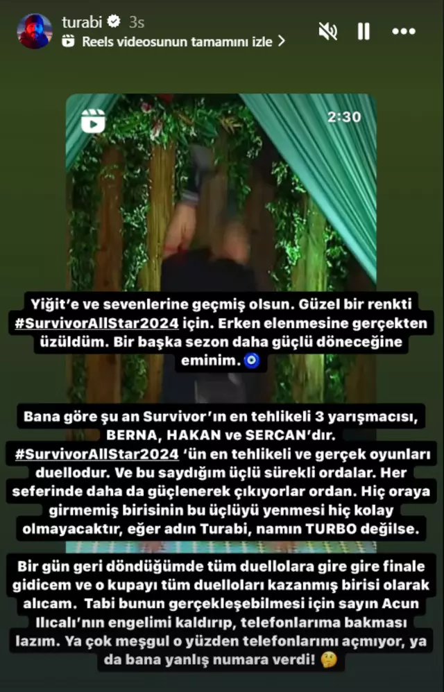 "Bana göre Survivor'ın en tehlikeli 3 yarışmacısı Berna, Hakan ve Sercan'dır. Survivor'ın en tehlikeli ve gerçek oyunları düellodur. Ve saydığım üçlü sürekli oradalar. Her seferinde daha da güçlenerek çıkıyorlar oradan. Hiç oraya girmemiş birisinin bu üçlüyü yenmesi hiç kolay olmayacaktır, eğer adın Turabi, namın Turbo değilse..."
