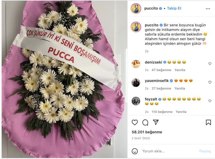 Çelengin fotoğrafını Instagram hesabından paylaşan Pucca, "ir sene boyunca bugün gelsin de intikamımı alayım diye sabırla sükutla erdemle bekledim ? Allahım hamd olsun sen beni hangi ateşinden içinden almışsın şükür" ifadesini kullandı.