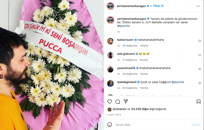 Karagöz şunları yazdı: Tamam da çelenk de göndermezsin be. Öldüm sandım!!! Mahalle cenazem var sandı.