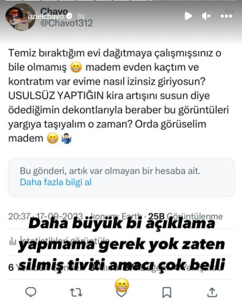Ünlü rapçının prodüktörüne de ulaşamadıklarını söyleyen Obdan, "2022 yılında TR’nin en çok dinlenen sanatçısı(!) Uzi’nin 4 aylık kirasını ödemeden kaçtığı ve çilingirle girebildiğimiz, Bomonti Anthill’deki dairemizin durumu. Muhatabımız olan prodüktörünün de sırra kadem basmış olması içler acısı. Belki utanırlar!" dedi.
