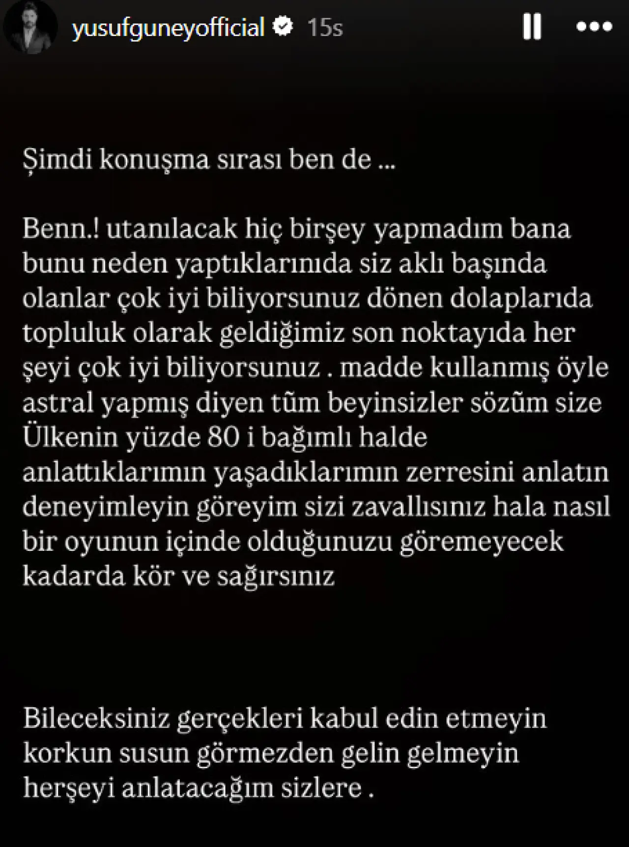 Daha önce yaptığı “astral seyahat” açıklamalarıyla da gündeme gelen Güney, kendisini eleştirenlere sert sözlerle yanıt verdi. “Ülkenin yüzde 80’i bağımlı hâlde” diyen şarkıcı, “Zavallısınız, hâlâ nasıl bir oyunun içinde olduğunuzu göremeyecek kadar kör ve sağırsınız. Her şeyi anlatacağım” sözleriyle tepkisini dile getirdi.