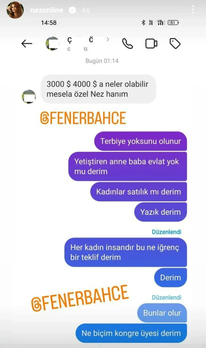 Profilinde "Fenerbahçe kongre üyesi" yazan Ç. Ö. adlı kişi tarafından kendisine yollanan "3 bin dolar veya 4 bin dolara neler olabilir mesela özel Nez Hanım" mesajına çok sert tepki gösterdi.