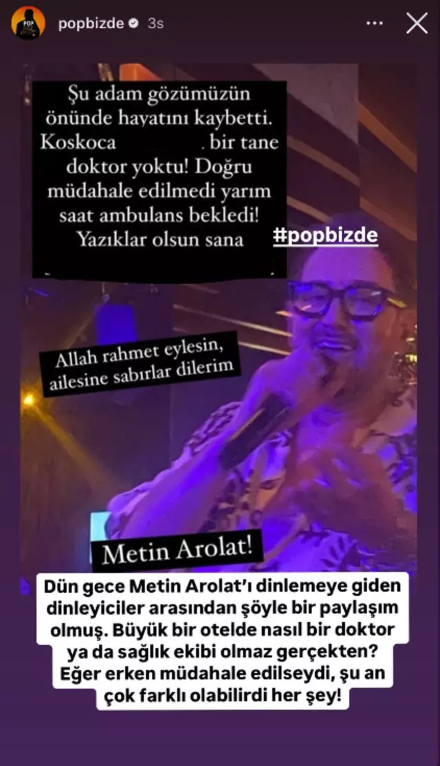 Metin Arolat'ın ölümünün ardından da çok konuşulacak bir iddia ortaya atıldı. Ünlü şarkıcıyı dinlemeye giden ve ölümüne şahit olan bir dinleyici, otelde doktor olmadığını ve yarım saat ambulans beklediklerini paylaştı. Dinleyicinin bu iddiası da ihmal ihtimalini akıllara getirdi.