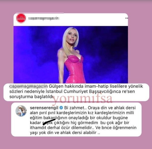 Twitter gündeminde birinci sırada yer alan Gülşen'e bir tepki de Seren Serengil'den geldi. Gülşen hakkında soruşturma başlatıldığını öğrenen Serengil, "Bir zahmet. Oraya din ve ahlak dersi alan pırıl pırıl kardeşlerimizin, kız kardeşlerimizin Milli Eğitim Bakanlığı'nın onayladığı bir okuldur. Bugüne kadar sapık çıktığını hiç görmedim. Bu çok ağır bir ithamdır derhal özür dilemelidir. Ve bence öğrenmenin yaşı yok, din ve ahlak dersi alabilir" dedi.
