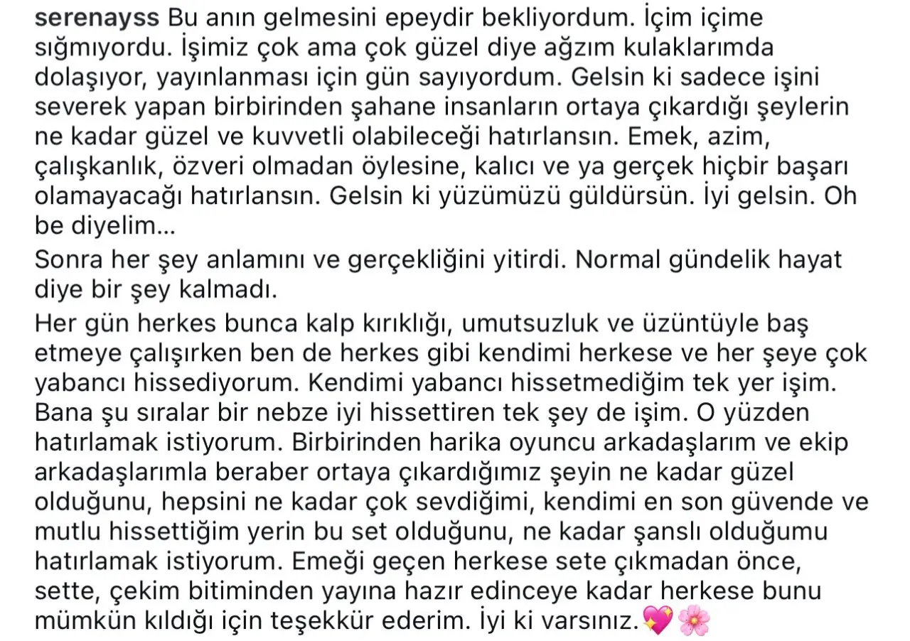 Barım'ın serbest bırakılması gerektiğini daha önce sosyal medya hesabından açıkça dile getiren Sarıkaya, bu kez hem yaşananlara hem de ruh haline dair daha kişisel ifadeler kullandı. "Her şey anlamını ve gerçekliğini yitirdi. Normal hayat diye bir şey kalmadı." diyen oyuncu, dış dünyayla bağının zayıfladığını şu sözlerle anlattı: