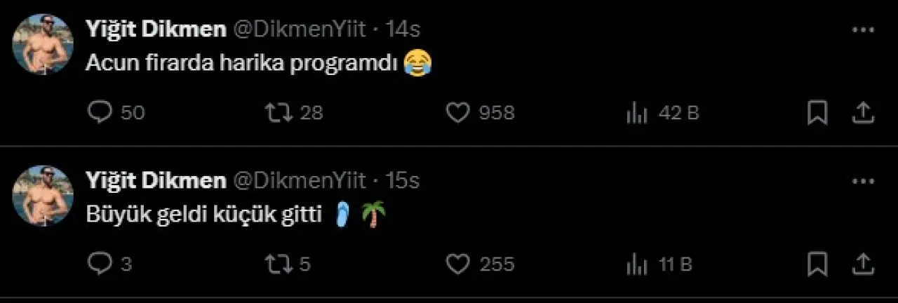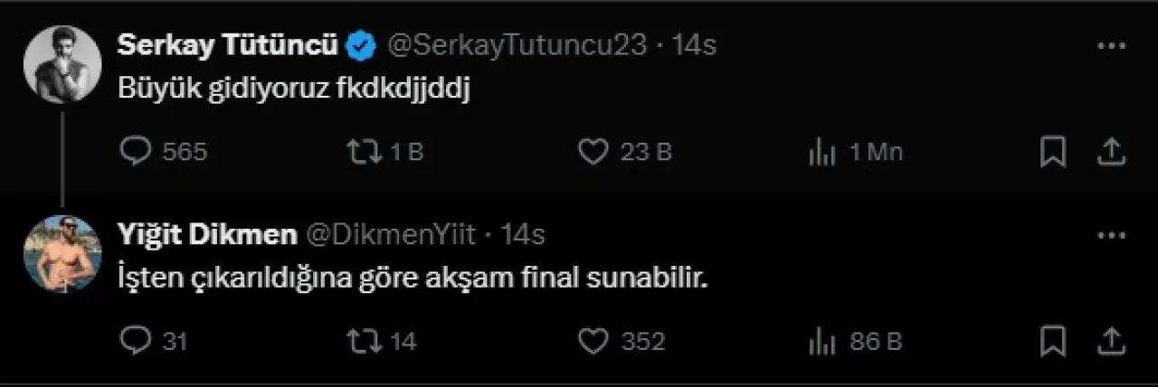 Göndermeler bununla da sınırlı kalmadı. Yiğit Dikmen, Acun Ilıcalı’nın geçmişte sunduğu “Acun Firarda” programına gönderme yaparak, “Acun Firarda harika programdı” paylaşımında bulundu. En dikkat çekici yorum ise Tütüncü’nün tweetine verdiği “İşten çıkarıldığına göre akşam final sunabilir” yanıtı oldu.