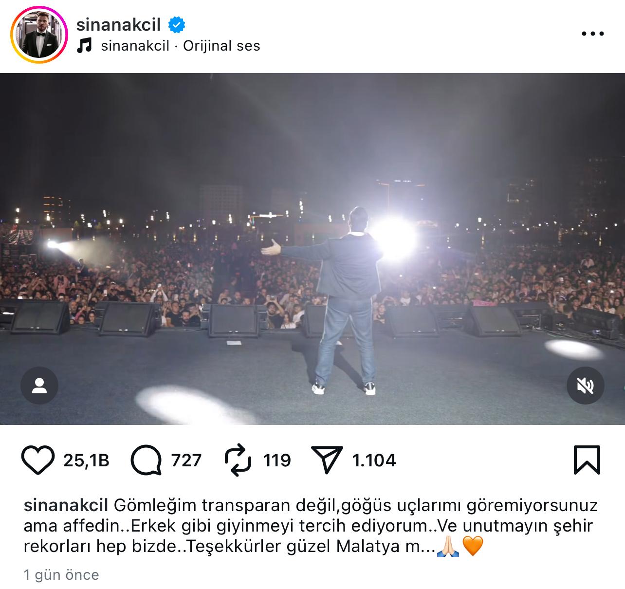 Sahne kıyafetleri konusundaki çıkışlarıyla gündemden düşmeyen Sinan Akçıl, bu kez Malatya konserinden paylaştığı bir gönderiyle dikkatleri üzerine çekti. Şarkıcı, paylaştığı sosyal medya paylaşımının altına, geçen hafta sahne kıyafeti gündem olan Edis'i hedef alarak şunları yazdı: