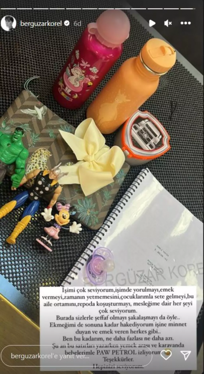 Gelen eleştirilerden sonra açıklama yapmak durumunda kalan oyuncu "İşimi seviyorum, işimde yorulmayı, zamanın yetmemesini, çocuklarımla sete gelmeyi mesleğime dair her şeyi seviyorum" dedi.
