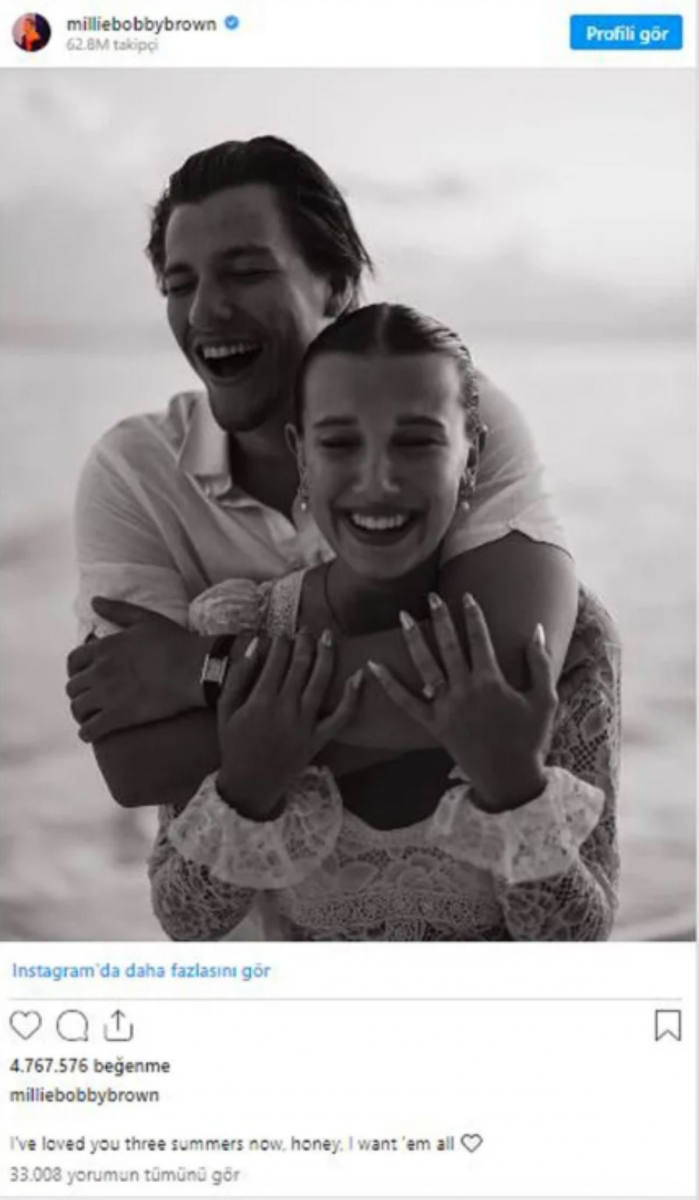 'Stranger Things', 'Enola Holmes' gibi yapımlarla tanınan İngiliz oyuncu Millie Bobby Brown ve bir süredir birlikte olduğu Jake Bongiovi nişanlandı. 19 yaşındaki yıldız ile rock müziğin efsane ismi Jon Bon Jovi’nin oğlu olan Bongiovi, evlilik yolunda attıkları ilk adımı sosyal medya hesaplarında paylaştı.