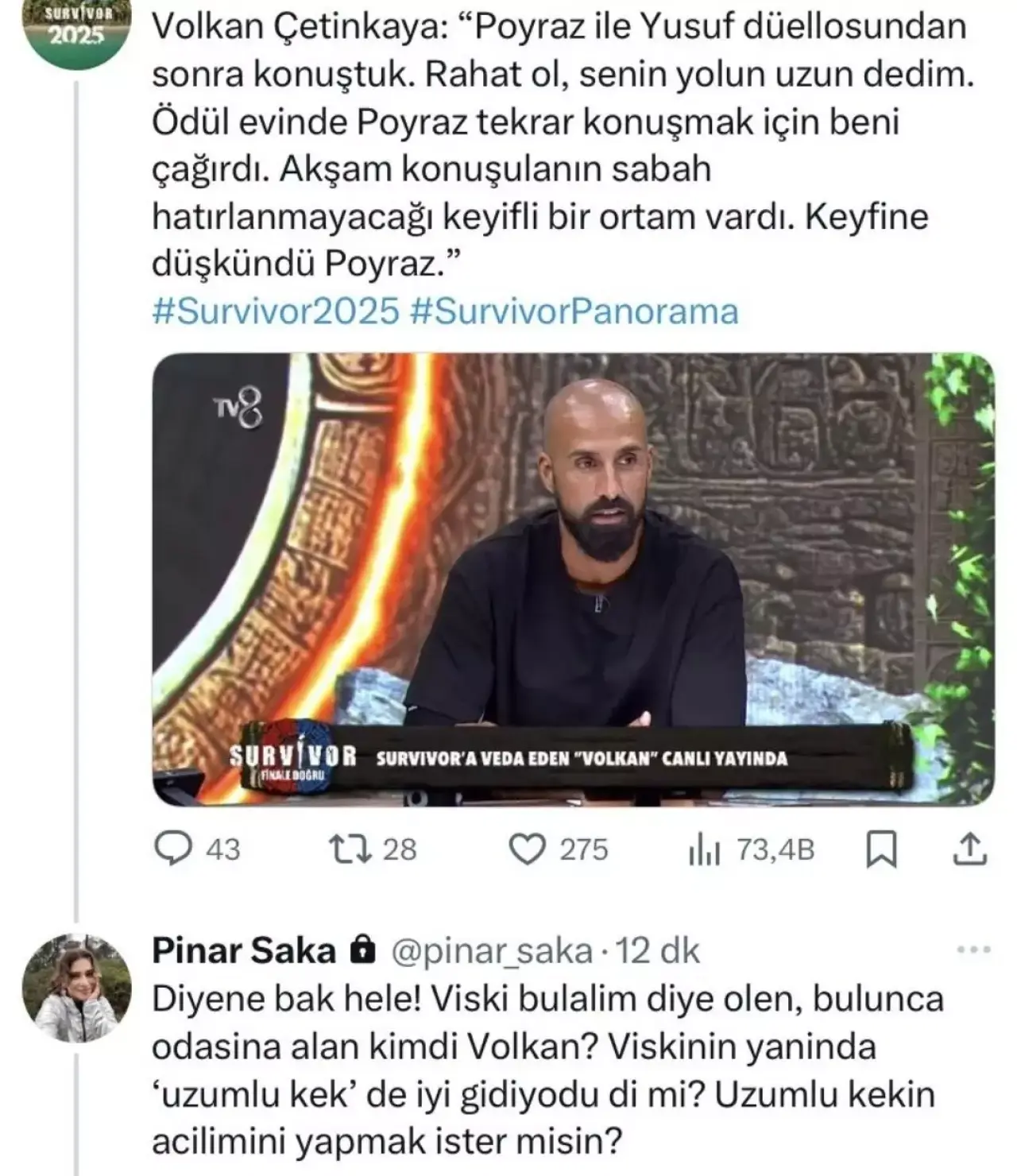 Volkan Çetinkaya'nın Poyraz hakkında yaptığı açıklamalara sinirlenen Pınar, sosyal medyada yaptığı imalı paylaşımla dikkatleri üzerine çekti. Volkan’ın “Poyraz’la ödül evinde keyifli bir ortamdaydık” şeklindeki sözlerine gönderme yapan Saka, zehir zemberek ifadeler kullandı: