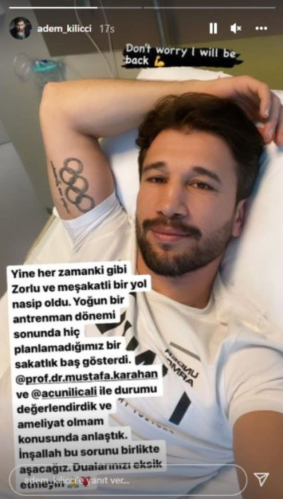 Hastanede çektiği bir fotoğrafı Instagram hesabından paylaşan Adem Kılıçcı, "Yine her zamanki gibi zorlu ve meşakkatli bir yol nasip oldu. Yoğun bir antrenman dönemi sonunda hiç planlamadığımız bir sakatlık baş gösterdi. Acun Ilıcalı ve doktorumuzla durumu değerlendirdik ve ameliyat olma konusunda anlaştık" dedi.