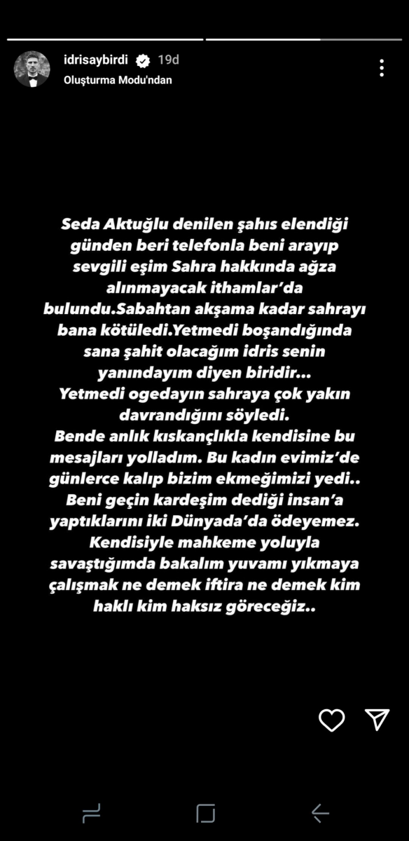 Sahra'nın eşi İdris ile mesajlaşmalarını ifşa eden Seda, iddialara bu şekilde yanıt vermeyi tercih etti.