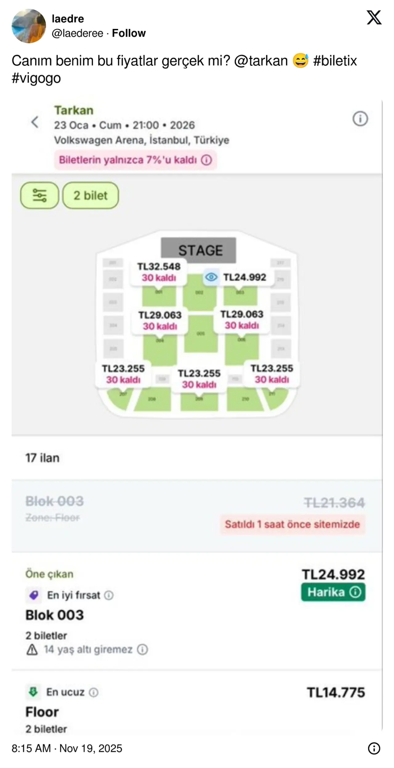 Biletler bugün saat 11:00’de satışa sunuldu. Ancak yoğun ilgi nedeniyle bilet satış sitesi Biletix çöktü. Siteye erişebilenler ise fiyatlar karşısında adeta şoke oldu. Konser biletleri 24.000 TL’den başlayıp 32.548 TL’ye kadar yükseldi.