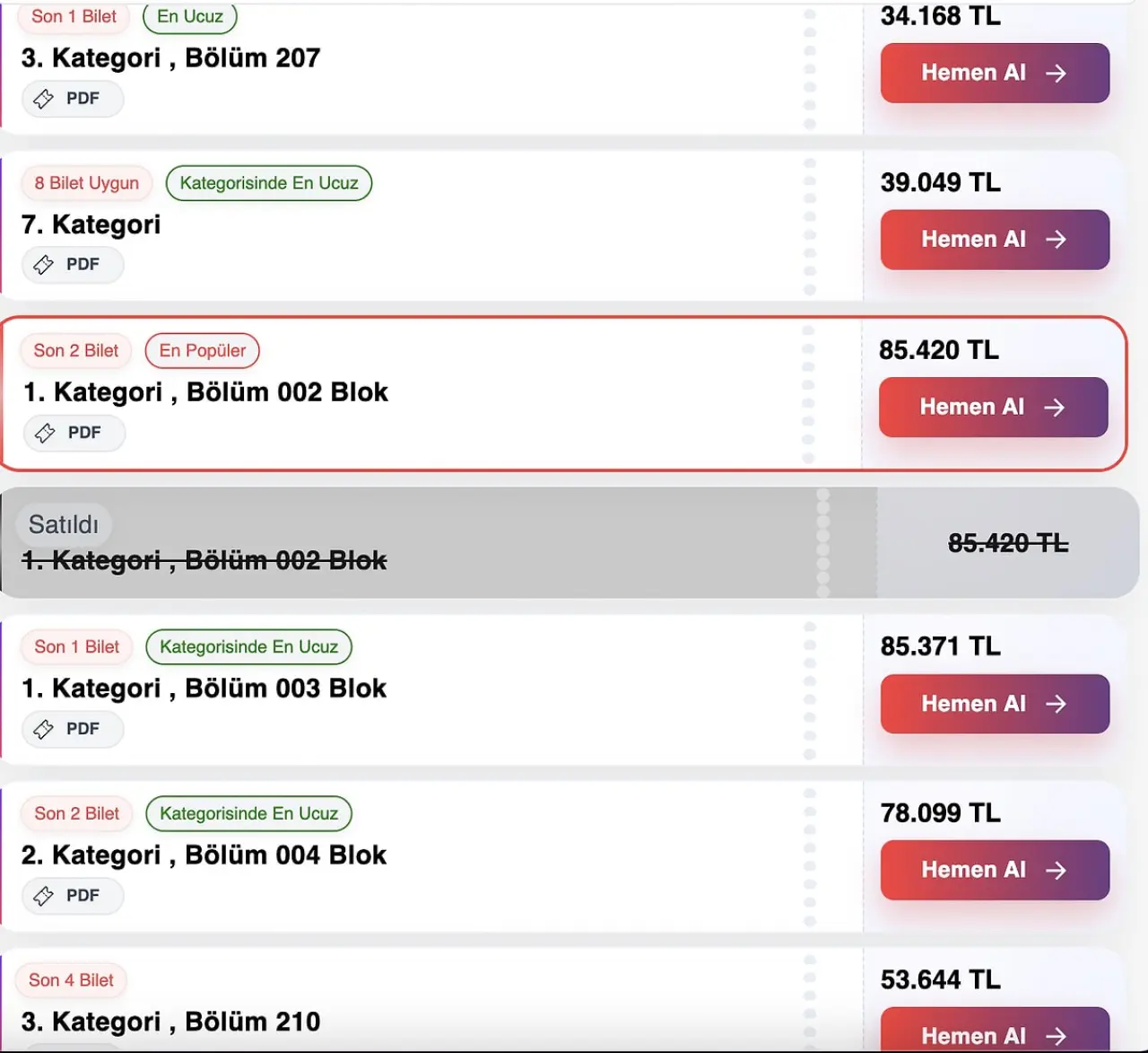 Tribün 1. Kategori: 9.975 TL