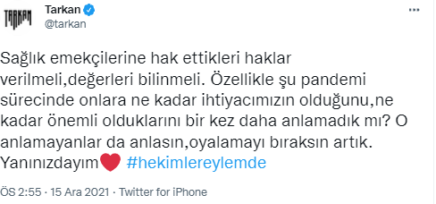 Tarkan, sağlık çalışanlarının yaptığı grevi destekledi ve Twitter hesabından paylaşımda bulundu.