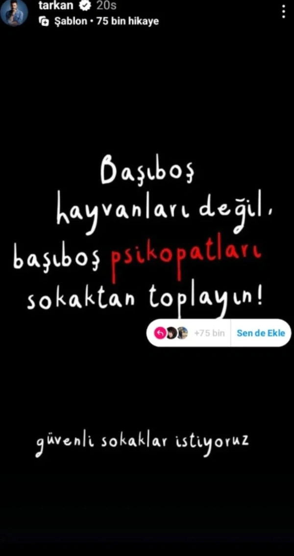 Şarkıcı, daha sonra yaptığı bir başka paylaşımda, sokak köpeklerinin toplatılması tartışmalarına atıfta bulunarak, "Başıboş hayvanları değil, başıboş psikopatları sokaktan toplayın!" sözleriyle güvenli sokaklar için çağrı yaptı.