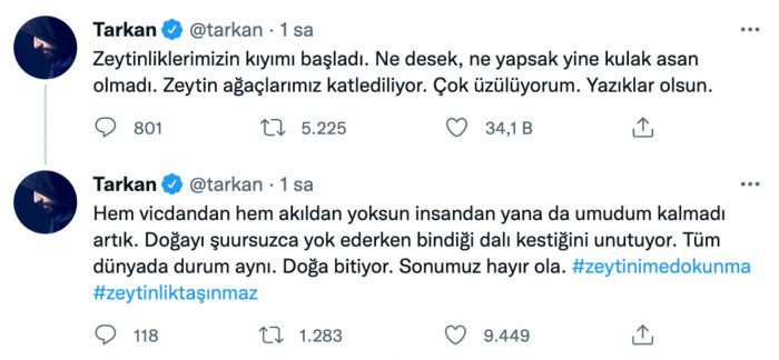 Tarkan, "Zeytinliklerimizin kıyımı başladı. Ne desek, ne yapsak yine kulak asan olmadı. Zeytin ağaçlarımız katlediliyor. Çok üzülüyorum. Yazıklar olsun." paylaşımında bulundu. "Hem vicdandan hem akıldan yoksun insandan yana da umudum kalmadı artık. Doğayı şuursuzca yok ederken bindiği dalı kestiğini unutuyor. Tüm dünyada durum aynı" diye yazan Tarkan, "Doğa bitiyor. Sonumuz hayır ola. Zeytinime dokunma, zeytinlik taşınmaz." ifadelerini kullandı.