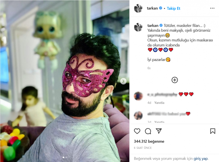 Megastar Tarkan paylaşımına ” Tütüler, maskeler filan… Yakında beni makyajlı, ojeli görürseniz şaşırmayın Olsun, kızımın mutluluğu için maskarası da olurum icabında” ifadelerini kullandı.