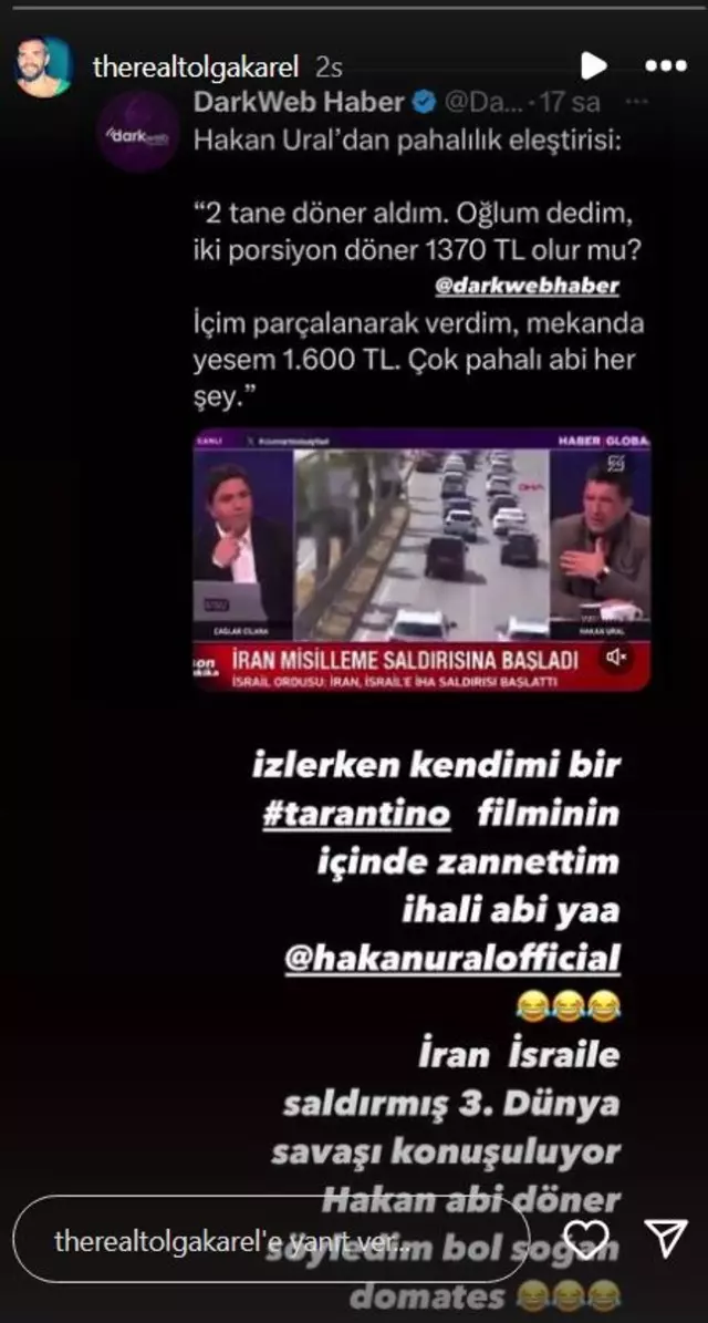 "İzlerken kendimi bir Tarantino filminin içinde zannettim ilahi abi ya" diyen oyuncu Karel devamında "İran İsrail'e saldırmış 3. Dünya Savaşı konuşuluyor Hakan Abi döner söyledim bol soğan domates..." dedi.
