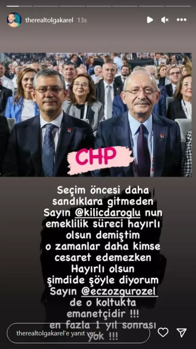 Tolga Karel paylaşımında "Hayırlı olsun şimdi de şöyle diyorum Sayın Özgür Özel de o koltuk da emanetçidir. En fazla bir yıl sonra yok" dedi.