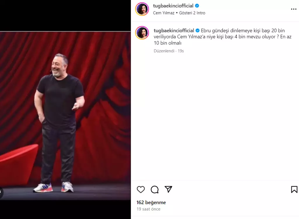 "Ebru Gündeşi dinlemeye kişi başı 20 bin veriliyor da, Cem Yılmaz’a niye kişi başı 4 bin mevzu oluyor? En az 10 bin olmalı."