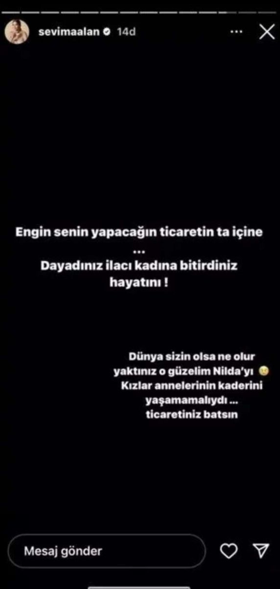 Sevim Alan paylaşımında, "Dayadınız ilacı kadına, bitirdiniz hayatını. Dünya sizin olsa ne olur, yaktınız güzelim Nilda'yı. Kızlar annelerinin kaderini yaşamamalıydı. Ticaretiniz batsın" ifadelerini kullandı.