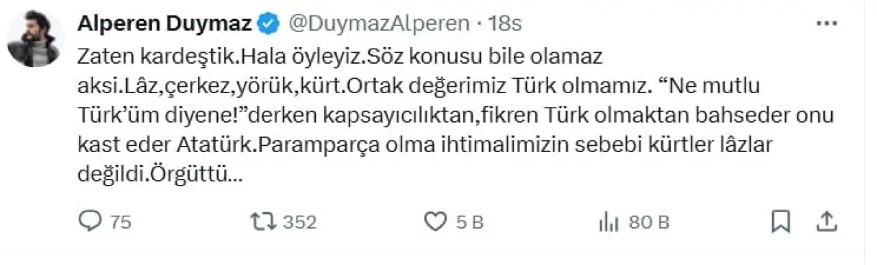 Duymaz, "Zaten kardeştik. Hâlâ öyleyiz. Söz konusu bile olamaz aksi. Lâz, Çerkez, Yörük, Kürt. Ortak değerimiz Türk olmamız. 'Ne mutlu Türk'üm diyene!' derken kapsayıcılıktan, fikren Türk olmaktan bahseder onu kast eder Atatürk. Paramparça olma ihtimalimizin sebebi Kürtler Lâzlar değildi. Örgüttü…" ifadelerini kullandı.