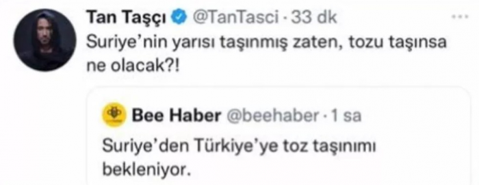 Mülteci-sığınmacı konusunda daha önce de tepkisini dile getiren ünlü şarkıcı Tan Taççı, bu defa hava durumu haberini alıntılayarak, "Suriye'nin yarısı taşınmış zaten, tozu taşınsa ne olacak?" yorumuyla sosyal medyada gündeme geldi.