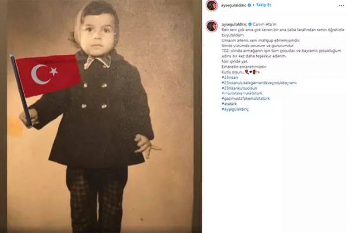 Şarkıcı Ayşegül Aldinç, yaptığı paylaşıma; "Canım Ata’m Ben seni çok ama çok seven bir ana baba tarafından senin öğretinle büyütüldüm. Umarım ailemi, seni mahcup etmemişimdir. İzinde yürümek onurum ve gururumdur. 102. yılında armağanın için tüm çocuklar, ve bayramlı çocukluğum adına bir kez daha teşekkür ederim. Nur içinde yat" notunu düştü.