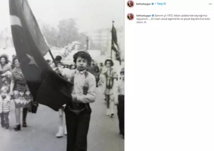 Oyuncu Behzat Uygur da Aldinç gibi çocukluk fotoğrafını paylaştı. Ünlü isim, paylaşımında; "Sanırım yıl 1972, Vatan caddesinde bayrağımızı taşıyorum. 23 Nisan Ulusal Egemenlik ve Çocuk Bayramı'mız kutlu olsun" ifadelerini kullandı.