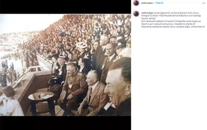 Sosyal medya hesabını aktif olarak kullanan ünlülerden biri olan Nedim Saban, Atatürk'ün katıldığı son bayram şenliği fotoğrafını paylaşarak, "Ulusal Egemenlik ve Çocuk Bayramı kutlu olsun. Fotoğraf 23 Nisan 1938 Mustafa Kemal Atatürk’ün son katıldığı bayram şenliği. Aynı derecede kalabalık olmayabilir fotoğraflar ancak kuşkusuz hepimiz aynı coşkuyla kutluyoruz" ifadelerini kullandı.