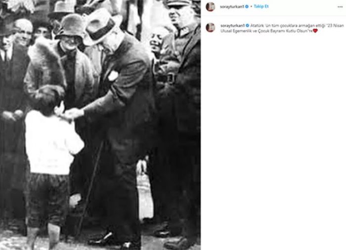 Yeşilçam'ın efsane oyuncularından Türkan Şoray, 23 Nisan Ulusal Egemenlik ve Çocuk Bayramı için yaptığı paylaşıma; "Atatürk ‘ün tüm çocuklara armağan ettiği 23 Nisan Ulusal Egemenlik ve Çocuk Bayramı Kutlu Olsun" notunu düştü.