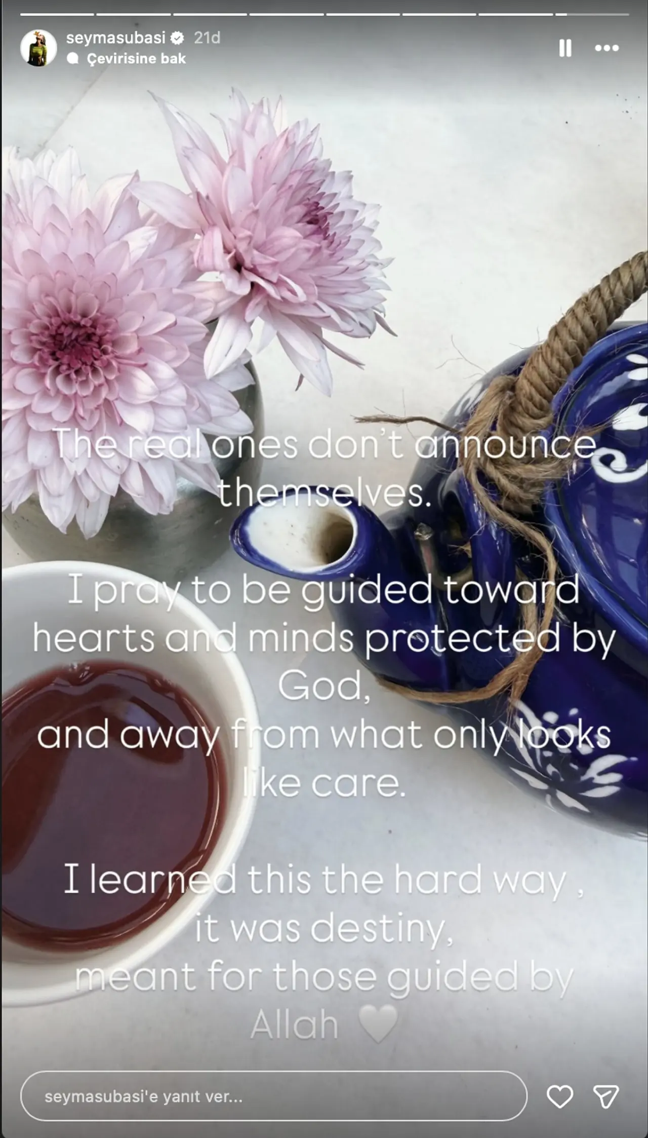 “Gerçek olan insanlar kendilerini ilan etmez. Allah tarafından korunmuş kalplere ve zihinlere yönlendirilmeyi diliyorum; yalnızca ‘ilgi’ gibi görünen şeylerden de uzak durmayı… Bunu zor yoldan öğrendim. Bu kaderdi ve Allah’ın yol gösterdiği, rehberliğinde olan kişiler için yazılmıştı.”