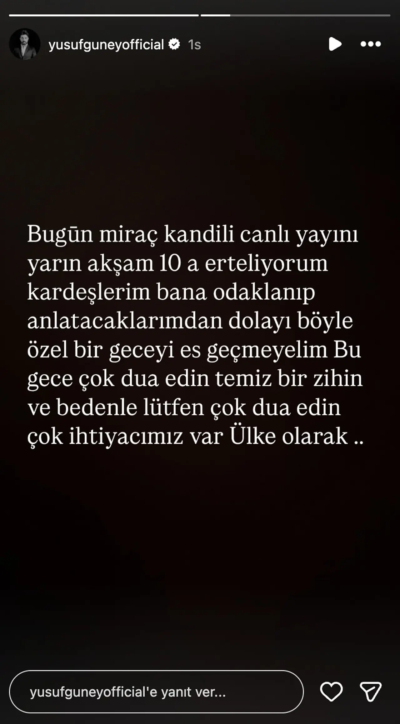 “Bugün Miraç Kandili. Canlı yayını yarın akşam 10’a erteliyorum kardeşlerim. Bana odaklanıp anlatacaklarımdan dolayı böyle özel bir geceyi es geçmeyelim. Bu gece çok dua edin. Temiz bir zihin ve bedenle lütfen çok dua edin. Çok ihtiyacımız var ülke olarak…”