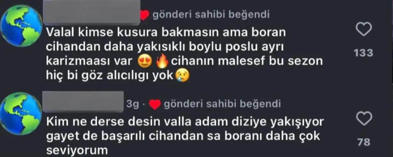 Oyuncunun Instagram hesabında iki yoruma beğeni bıraktığı ortaya çıktı. Bu beğeniler arasında Boran karakterine destek veren ifadelerin olması, Alya–Cihan hayranlarını adeta çileden çıkardı. Sosyal medyada kısa sürede tartışma başlarken, pek çok izleyici Kümbetlioğlu'na yorum yağdırdı.