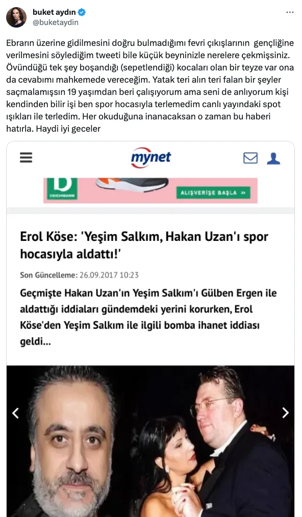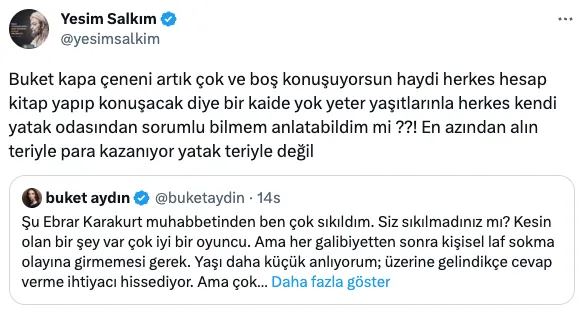 Sanatçı Yeşim Salkım da Buket Aydın'ın paylaşımını alıntılayarak, "Buket kapa çeneni artık çok ve boş konuşuyorsun haydi herkes hesap kitap yapıp konuşacak diye bir kaide yok yeter yaşıtlarınla herkes kendi yatak odasından sorumlu bilmem anlatabildim mi?! En azından alın teriyle para kazanıyor yatak teriyle değil" ifadeleriyle sert bir yanıt verdi.