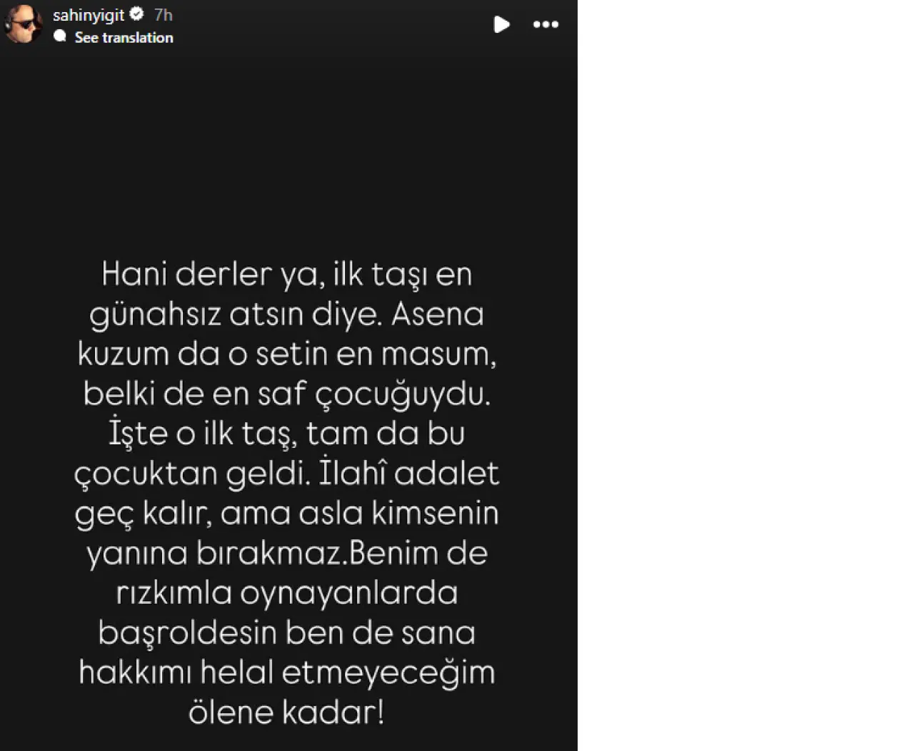 Şahin Yiğit, sosyal medya hesabından yaptığı paylaşımda, "Benim de rızkımla oynayanlarda başroldesin, ben de sana hakkımı helal etmeyeceğim ölene kadar! Hani derler ya, ilk taşı en günahsız atsın diye. Asena kuzum da o setin en masum, belki de en saf çocuğuydu. İşte o ilk taş, tam da bu çocuktan geldi. İlahi adalet geç kalır, ama asla kimsenin yanına bırakmaz," ifadelerini kullandı.