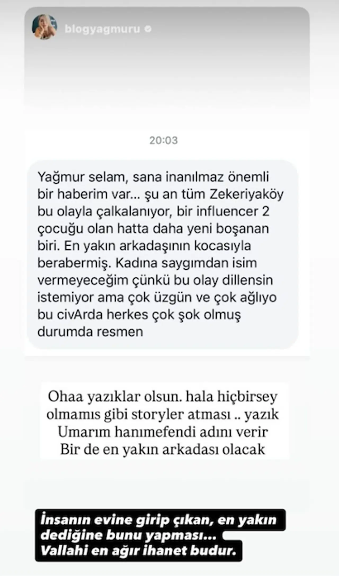 “Şu an tüm Zekeriyaköy bu olayla çalkalanıyor. İki çocuğu olan, daha yeni boşanan bir influencer… En yakın arkadaşının kocasıyla berabermiş. Kadına saygımdan isim vermiyorum ama çok üzgün, çok ağlıyor. Herkes şok durumda.”