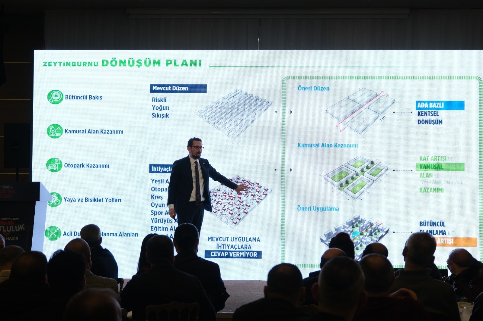 Zeytinburnu nüfusunun %95`i, yüzölçümünün yarısında yaşıyor. Bu yoğun nüfus beraberinde hem trafik yoğunluğu ve otopark eksikliği hem de yetersiz kamusal alanlar olarak ortaya çıkan sorunları doğuruyor. Kentsel dönüşüm, tam olarak yukarıda özetlediğim hususlar gibi pek çok sorunu bir arada çözmek ve sürdürülebilirliği sağlamak adına gerçekleştirilmesi gereken bir olay. Ancak ilçemizde “kentsel dönüşüm” adı altında yapılan düzenlemeler amacına hizmet etmediğinden vatandaş için çözüm olarak anılması gereken kentsel dönüşüm, adeta en büyük sorun haline gelmiştir. Afet master planımız ve kentsel dönüşüm çalışmalarımız ile Zeytinburnu’na hak ettiği hizmeti vereceğiz ve sorunlarımızı liyakatli ekiplerimizle çözeceğiz.