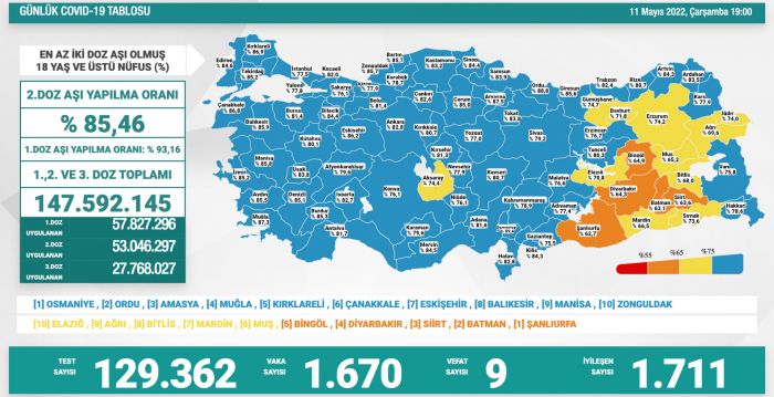 Sağlık Bakanlığı’nın 11 Mayıs'a ilişkin Koronavirüs verilerine göre; son 24 saat içerisinde yapılan 129 bin 362 testten bin 670 pozitif vaka tespit edildi. Virüs nedeniyle 9 kişi daha hayatını kaybetti. İyileşen hasta sayısı bin 711 olarak açıklandı.