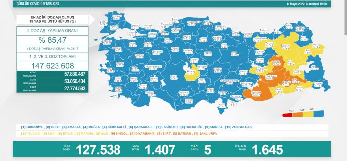 Buna göre, son 24 saatte 127 bin 538 Covid-19 testi yapıldı, 1407 kişinin testi pozitif çıktı, 5 kişi yaşamını yitirdi, iyileşenlerin sayısı ise 1645 oldu.
