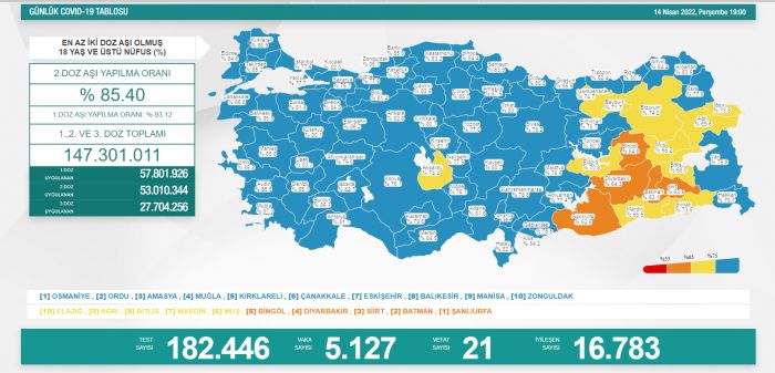Sağlık Bakanlığı, 'Günlük Covid- 19 Tablosu' verilerini açıkladı. Son 24 saatte yapılan 182 bin 446 testte 5 bin 127 vaka tespit edildi. 21 kişi hayatını kaybederken, 16 bin 783 kişinin de tedavisi ve karantinası sona erdi.