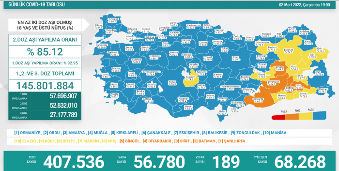 2 Mart 2022 koronavirüs tablosuna göre; 56 bin 780 kişi koronavirüse yakalandı.