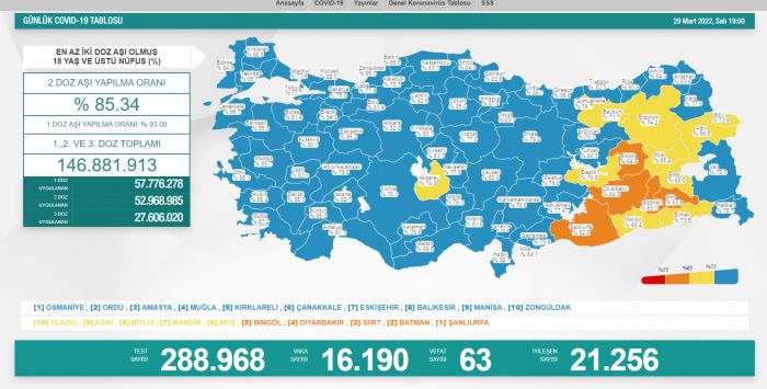 En az 2 doz aşı olmuş 18 yaş üzeri nüfusu kapsayan verilere göre Türkiye'de 2. doz aşılama ortalama yüzde 85,34 oldu. 1. doz ortalaması yüzde 93,08 olurken, 1., 2. ve 3. doz aşısını olan vatandaş sayısı toplamda 146 milyon 881 bin 913’e yükseldi.