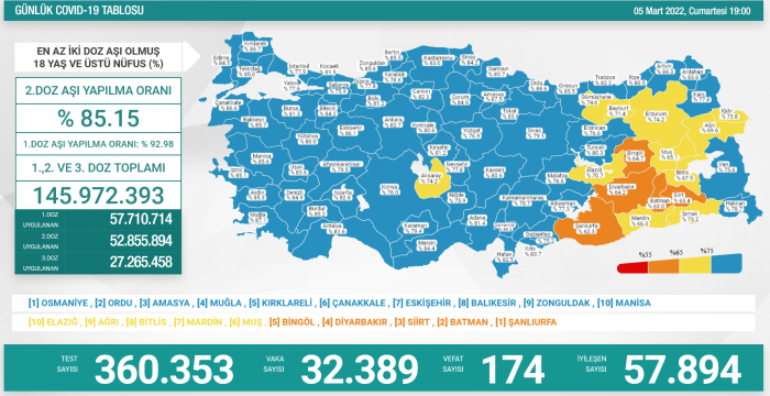 5 Mart 2022 koronavirüs tablosu verilerine göre; vaka sayısı 32 bin 389, iyileşen sayısı 57 bin 894 test sayısı 360 bin 353 olurken yaşamını yitiren kişi sayısı 174 oldu.