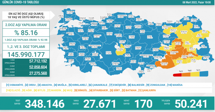6 Mart 2022 koronavirüs tablosuna göre; 27 bin 671 kişi koronavirüse yakalandı.
