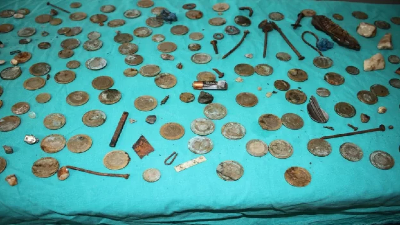 Bunun üzerine Genel Cerrahi Servisinde ameliyata alınan Z.D'nin midesinde, 1 liralık 83 madeni para, pil, mıknatıs, çivi, cam parçaları, taş ve vida gibi 233 malzeme çıkarıldı.