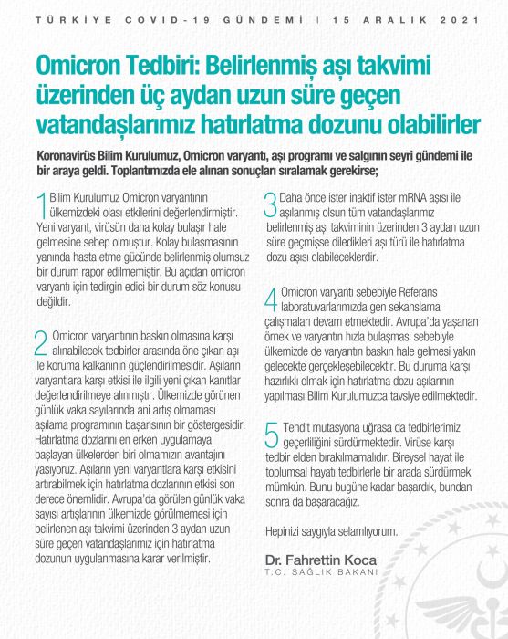 Bakan Koca, koronavirüs aşılama takvimi üzerinden 3 aydan uzun süre geçen vatandaşların Omicron varyantına karşı hatırlatma dozu olabileceğini açıkladı. Koca, hatırlatma dozu olmak isteyen kişilerin daha önce hangi aşıyı olmuş (Biontech, Sinovac) olursa olsun olabileceklerini aktardı.