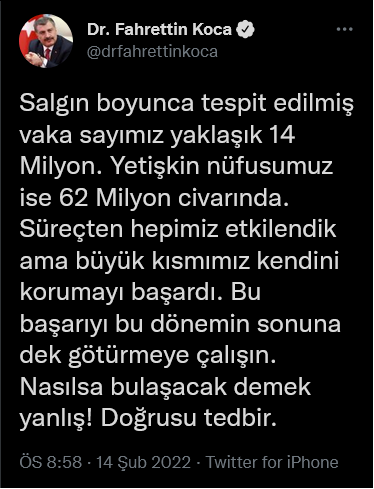 Salgın boyunca tespit edilmiş vaka sayımız yaklaşık 14 Milyon. Yetişkin nüfusumuz ise 62 Milyon civarında. Süreçten hepimiz etkilendik ama büyük kısmımız kendini korumayı başardı. Bu başarıyı bu dönemin sonuna dek götürmeye çalışın. Nasılsa bulaşacak demek yanlış! Doğrusu tedbir.