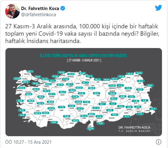 Sağlık Bakanı Fahrettin Koca, 27 Kasım-3 Aralık arasında illere göre her 100 bin kişide görülen Kovid-19 vaka sayılarını açıkladı. Buna göre, vaka sayısı her 100 bin kişide İstanbul'da 269,58, Ankara'da 182,37, İzmir'de 69,58 oldu.